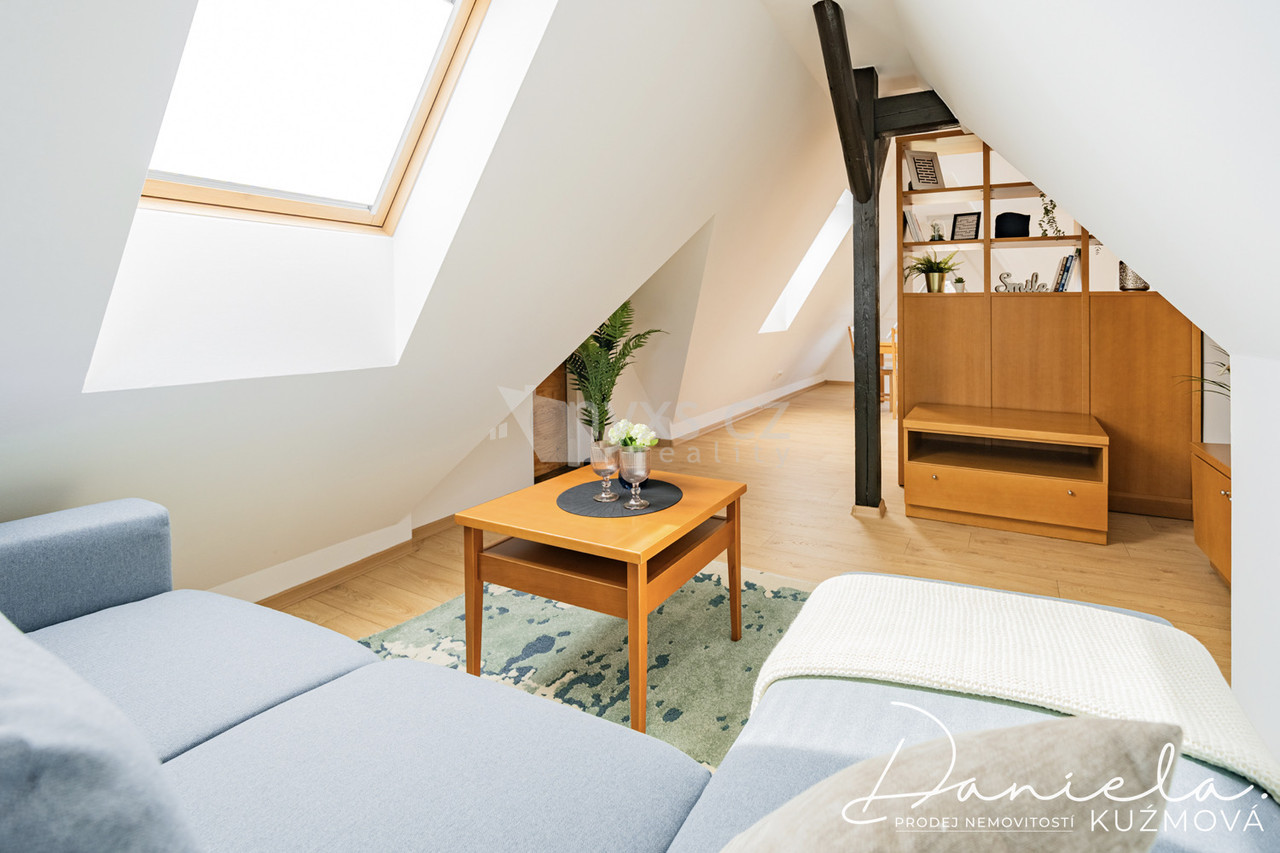 Nabízíme k podnájmu útulný a plně vybavený byt nacházející se v podkrovních prostorech vilového domu. V přízemí domu sídlí kanceláře, nad nimiž se nachází tři samostatné bytové jednotky určené k dlouhodobému pronájmu.