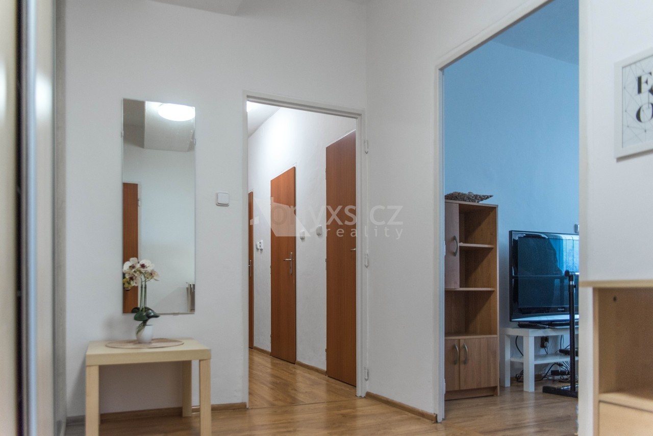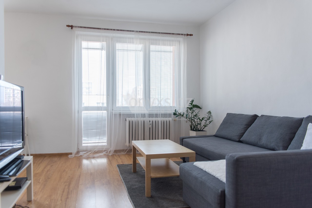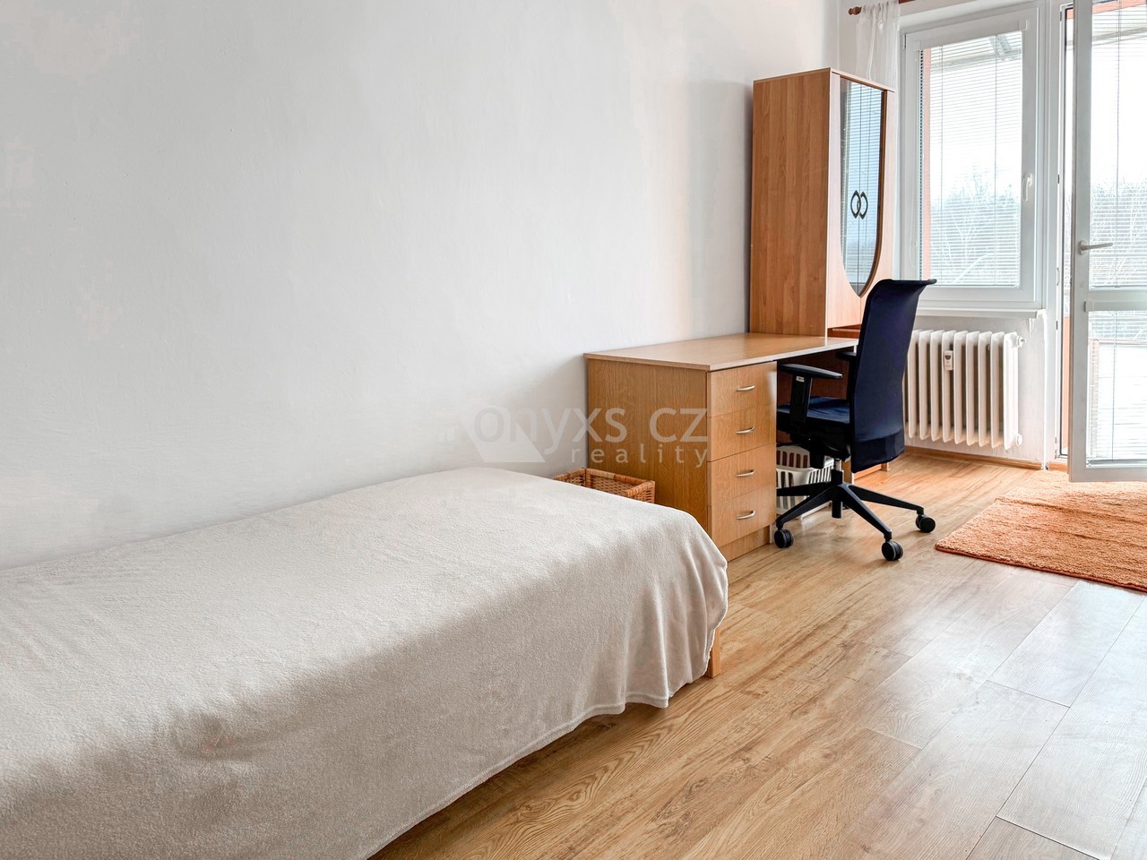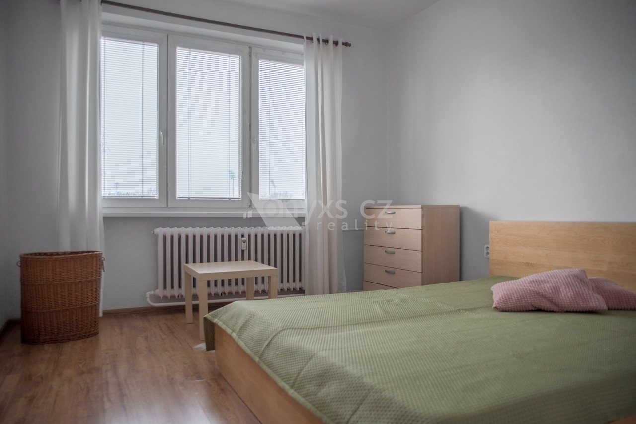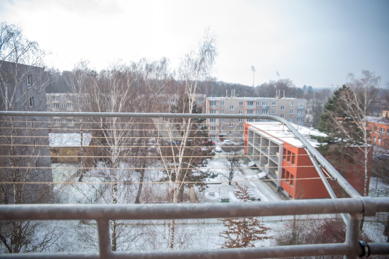 Byt se nachází v 5. patře panelového domu s výtahem. V bytě je vstupní chodba, koupelna s vanou, WC, ložnice s balkonem, pokoj, obývací pokoj se vstupem na druhý balkon, kuchyně a komora.
