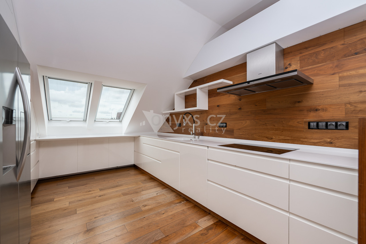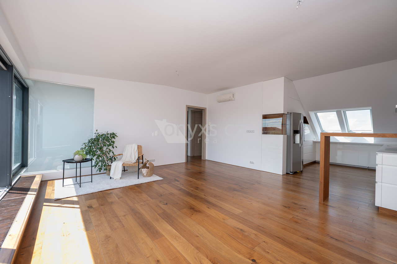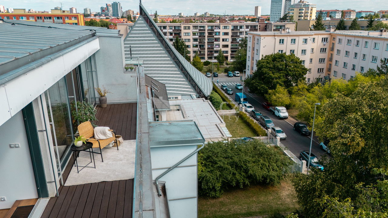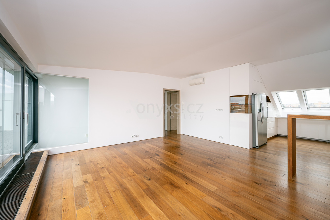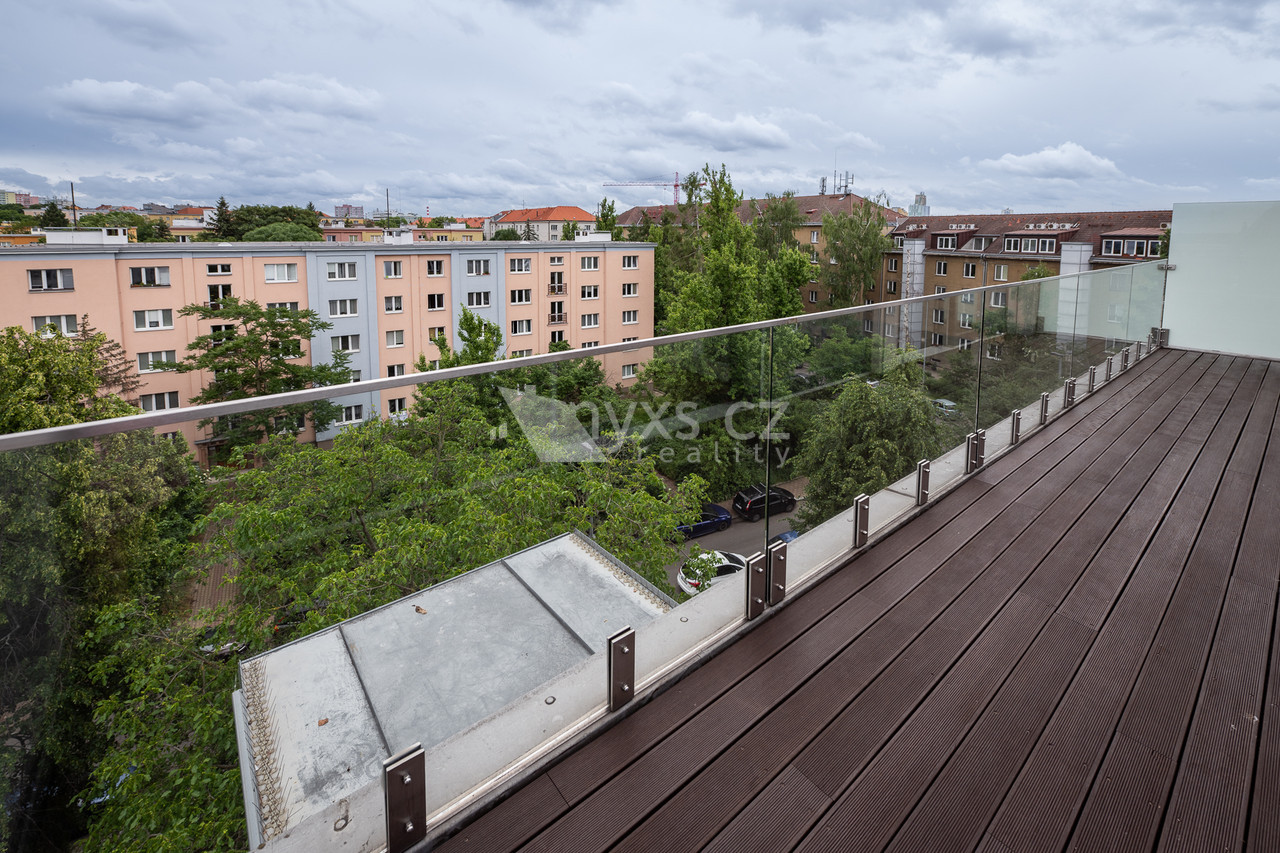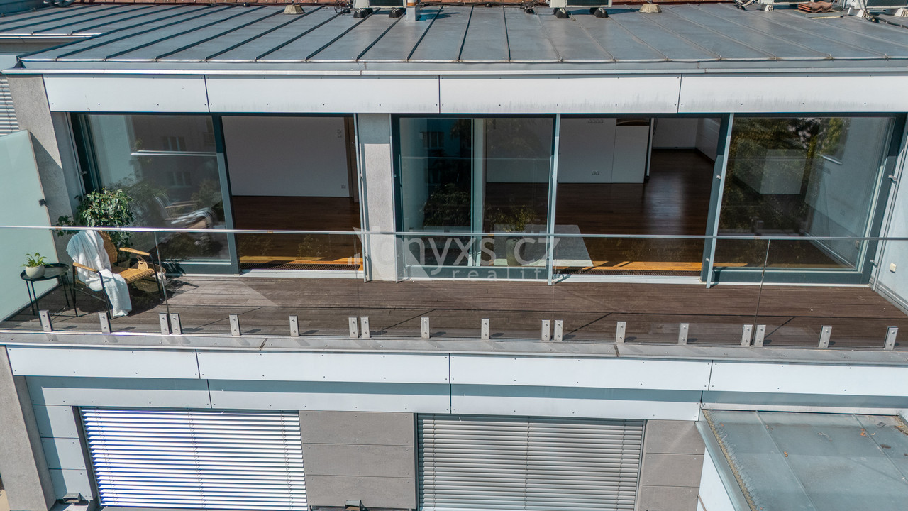 Nabízíme k pronájmu výjimečně světlý a klimatizovaný byt 4+kk o ploše 133 m² s prostornou terasou (terasa 14 m², byt 119m2), situovaný v naprostém klidu posledního patra cihlového domu.