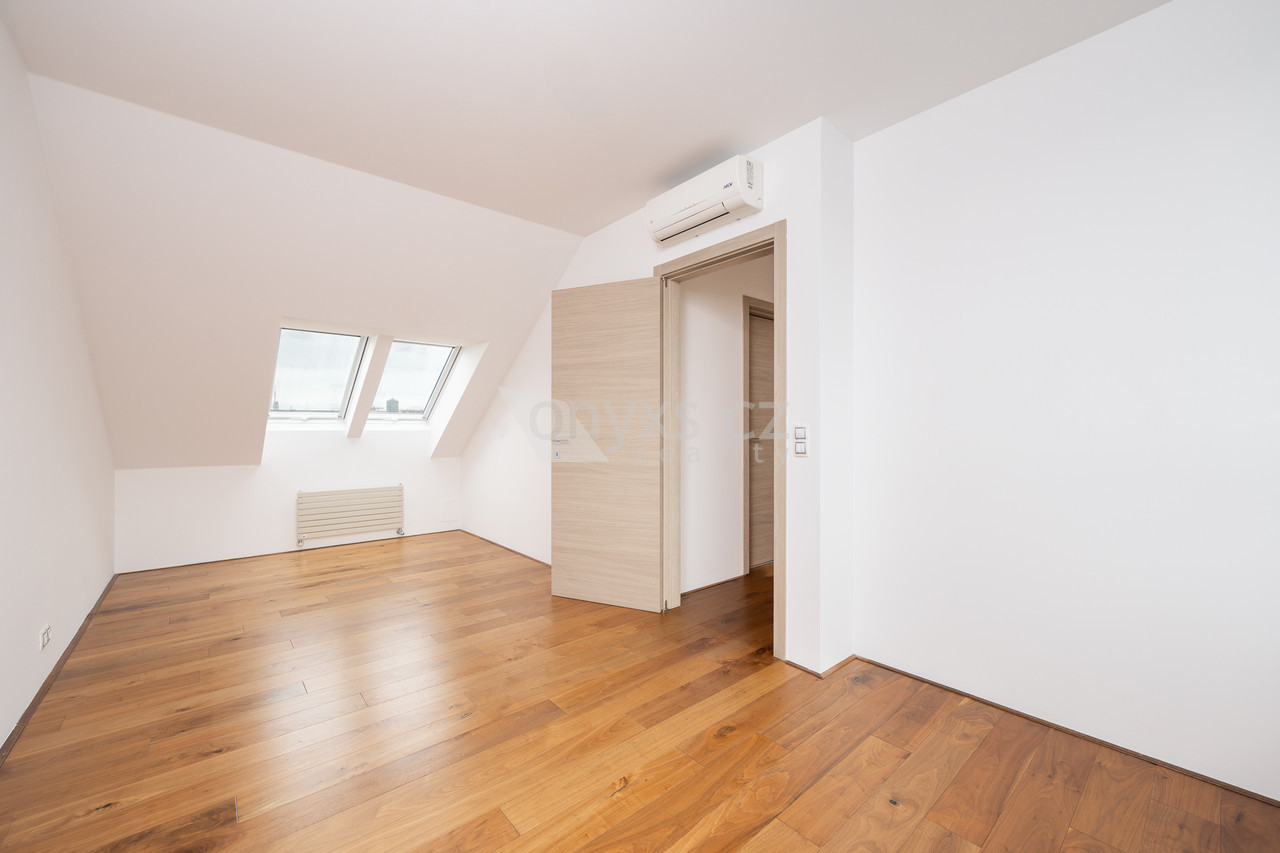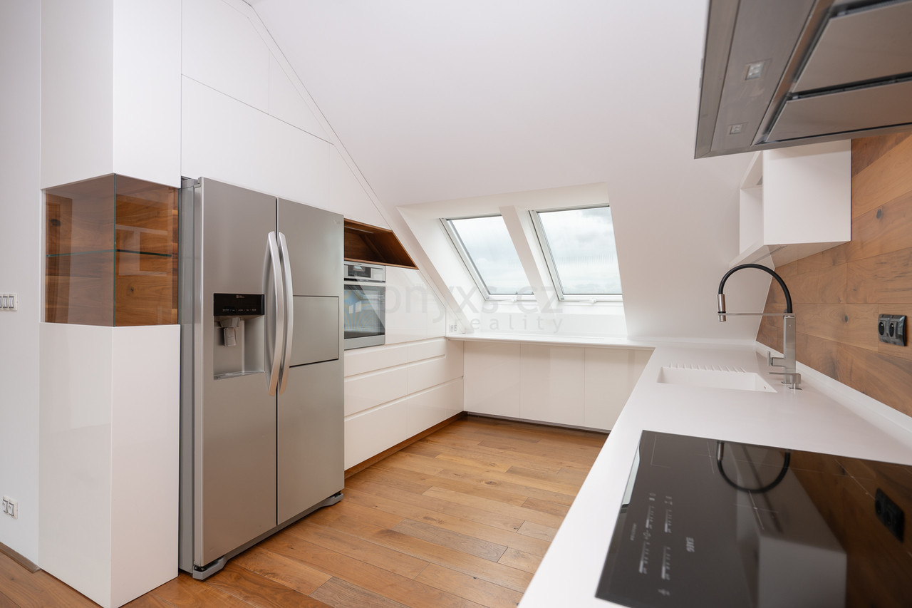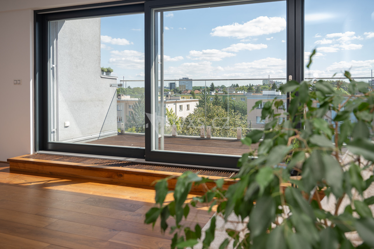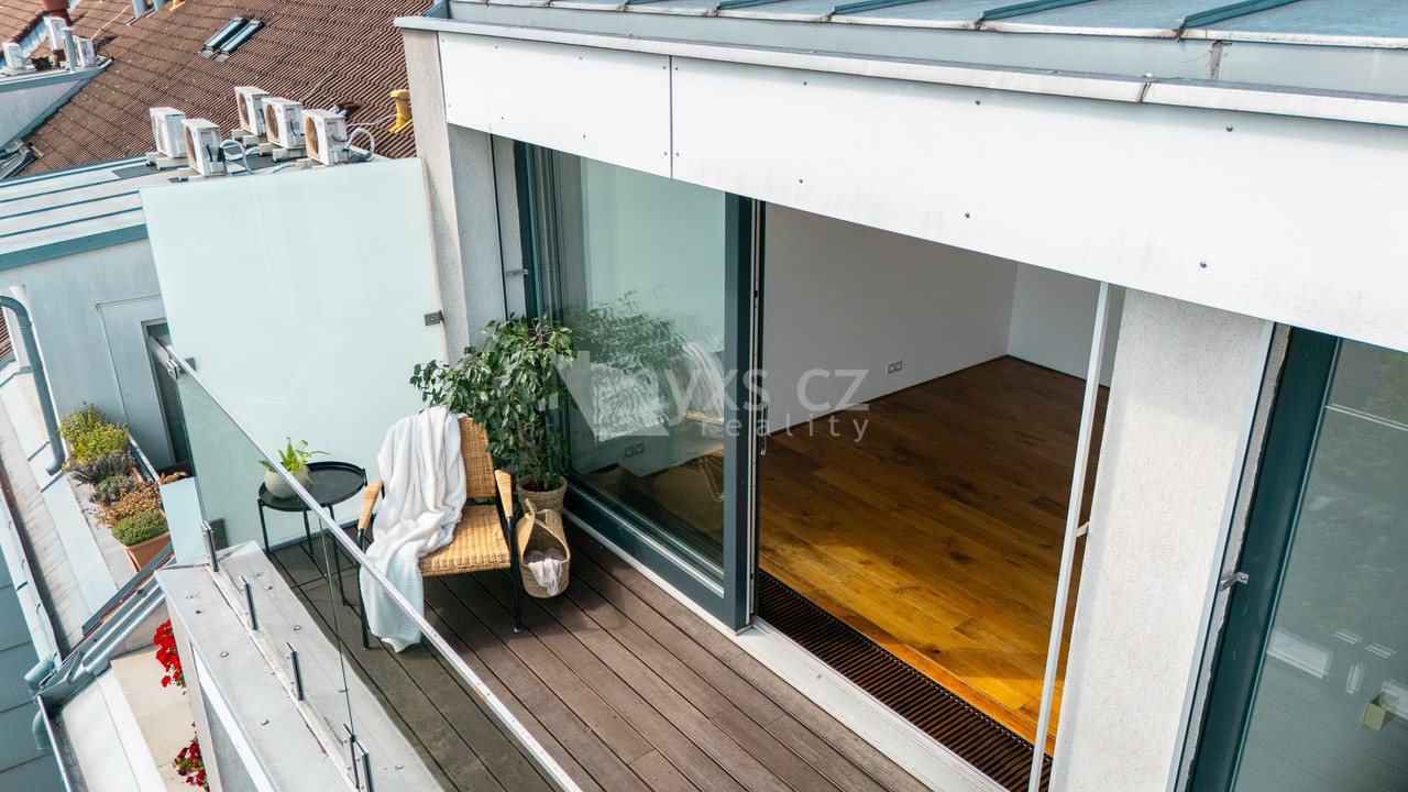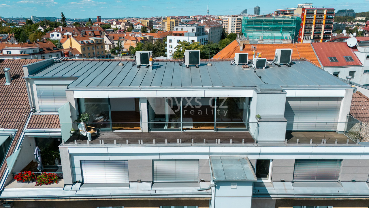 Nabízíme k pronájmu výjimečně světlý a klimatizovaný byt 4+kk o ploše 133 m² s prostornou terasou (terasa 14 m², byt 119m2), situovaný v naprostém klidu posledního patra cihlového domu.