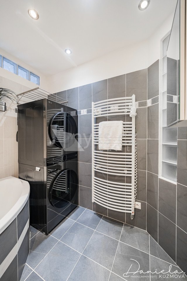 Koupelna je navržena s důrazem na komfort – prostorná vana se sprchovou zástěnou vám dopřeje zasloužený relax po náročném dni. Bez problému se sem vejde pračka i sušička a stále zůstává dostatek prostoru pro pohodlný pohyb. Denní světlo přes luxfery vytváří příjemnou atmosféru bez pocitu uzavřenosti.