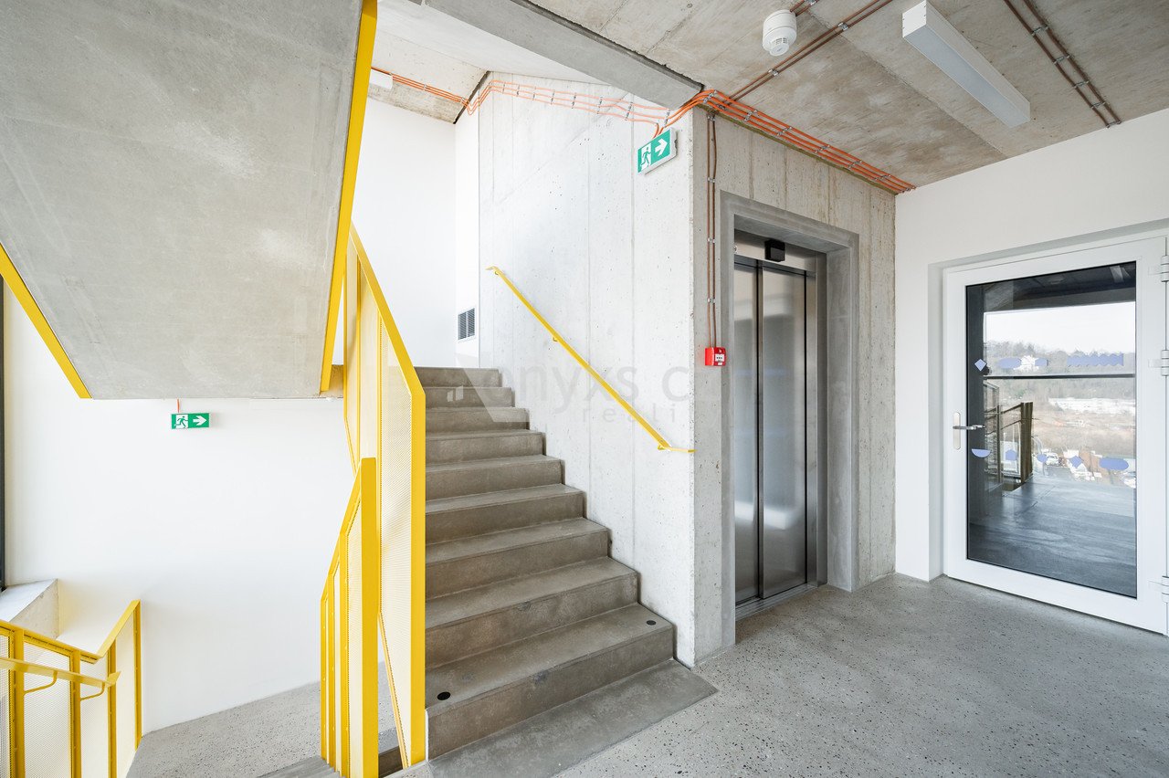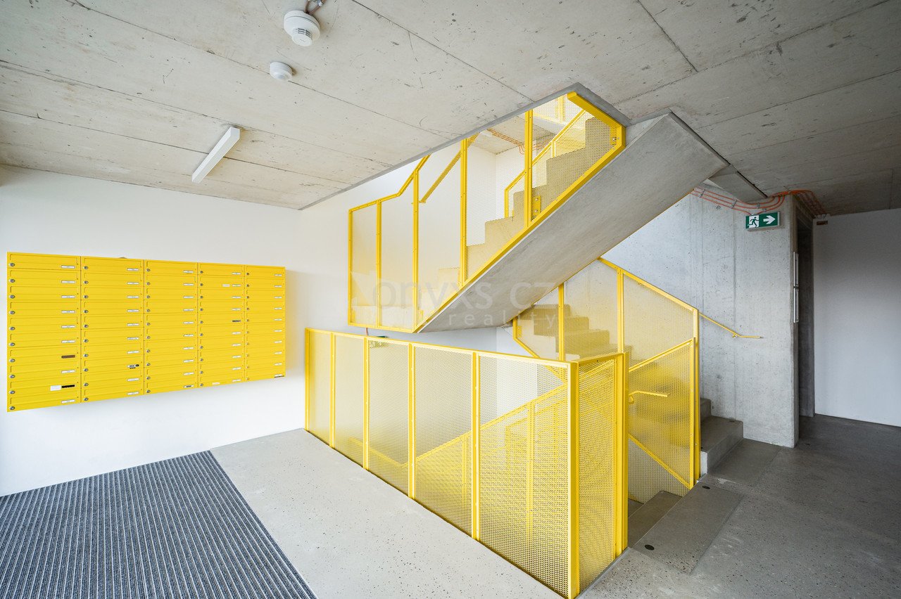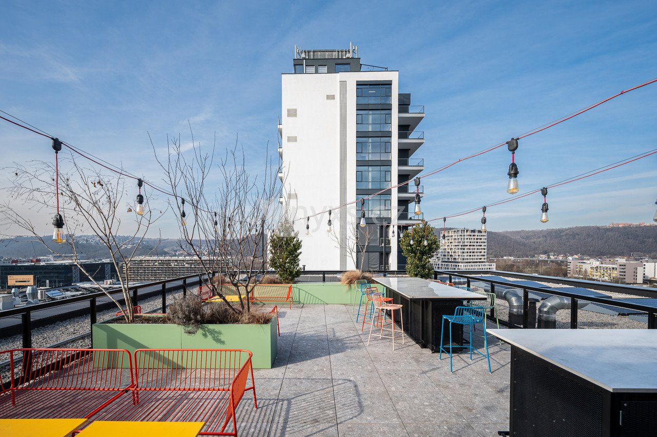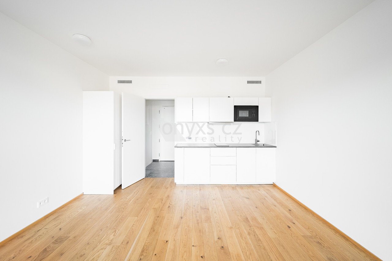 Bytu dominují posuvná velkoformátová okna a balkón se zábradlím z odolného skla. Balkón je orientován na sever a nabízí hezké výhledy. Dispozici bytu tvoří vstupní chodba s praktickou vestavěnou skříní, prostorný pokoj s plně vybaveným kuchyňským koutem, koupelna s velkoformátovými dlaždicemi a walk-in sprchovým koutem. Dřevěné plovoucí podlahy s podlahovým vytápěním, rekuperace, příprava na umístění klimatizačních jednotek a příprava na instalaci venkovních žaluzií. Součástí projektu je střešní terasa se zelení, klidným posezením a skoro 2000 m2 společných zahrad. Rezidentům je k dispozici velkorysá wellness zóna sousedního projektu Vanguard - potěší zde finská i parní sauna nebo 18-metrový bazén.