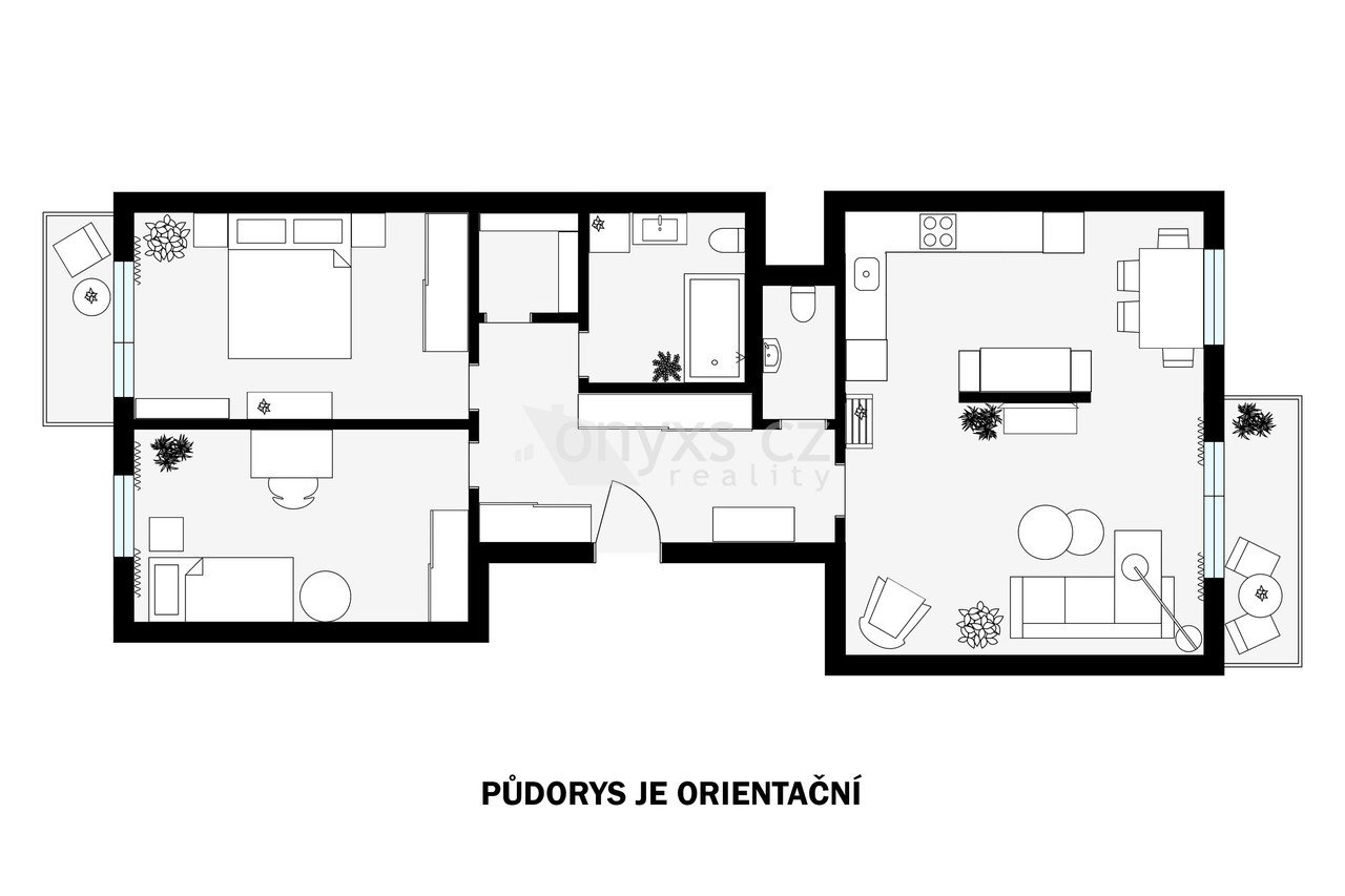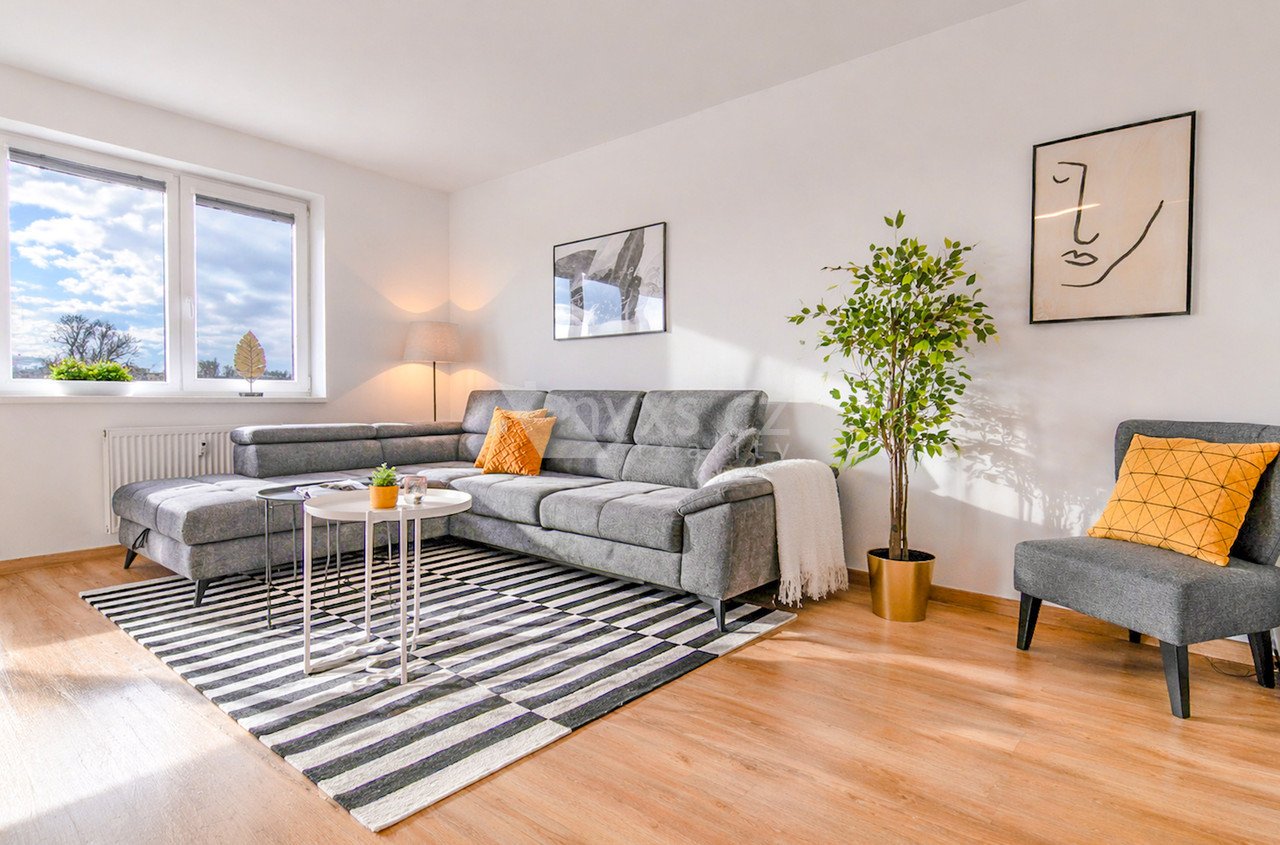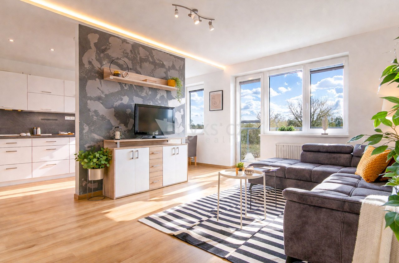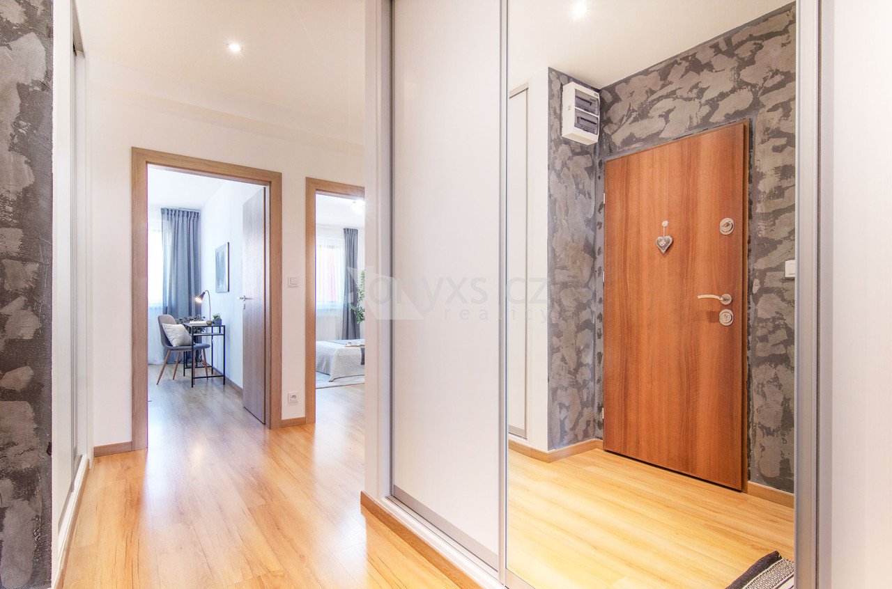Byt je chytře rozdělený na společenskou a klidovou část. Obývací pokoj s kuchyní a jídelním koutem je místem, kde se potkává rodina i přátelé. Dvě ložnice naopak nabídnou soukromí a prostor pro odpočinek.
