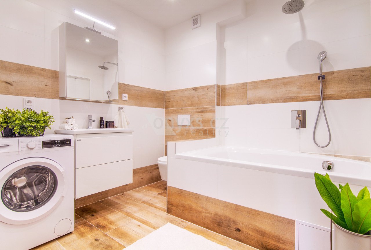 Vybavení bytu: Dva balkony, 2x WC, velká prostorná vana, klimatizace v ložnici, plovoucí laminátová podlaha, keramická dlažba, plastová okna s dvojskly, kuchyňská linka vyrobená truhlářem na míru s dostatkem úložných prostor a kvalitními spotřebiči AEG (indukční varná deska a el. trouba, myčka, mikrovlnná trouba), v obývacím pokoji stmívatelné osvětlení, v předsíni a v ložnicích na míru vyrobené prostorné vestavěné skříně, plynové vytápění a ohřev vody (plynová kotelna v domě), internetový optický kabel.