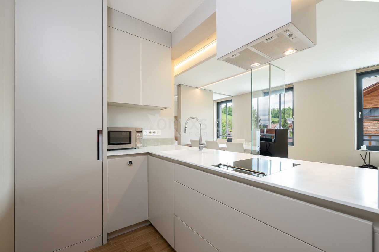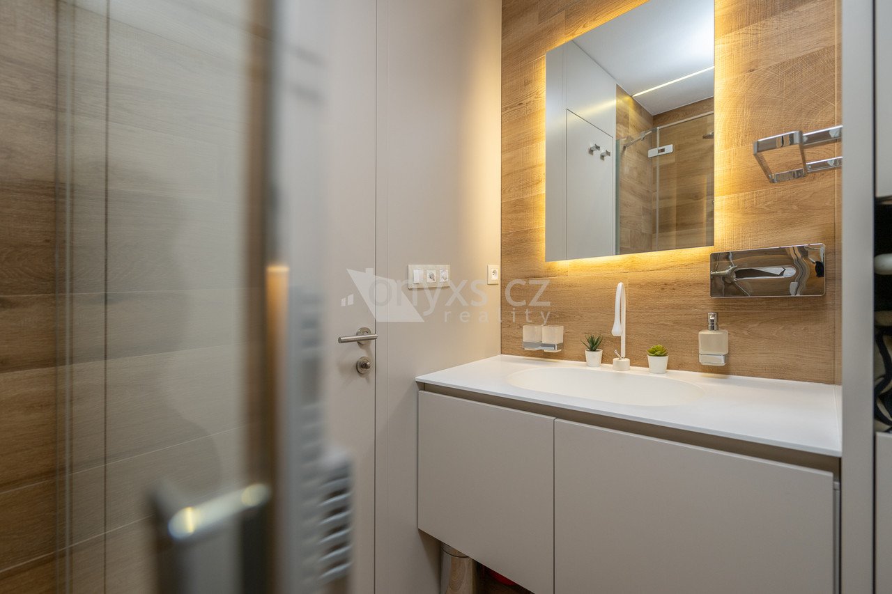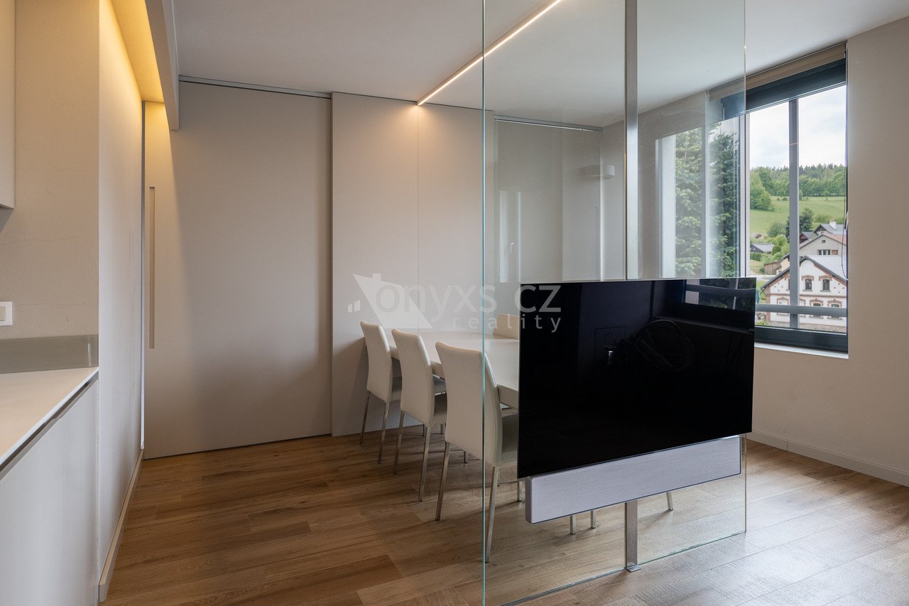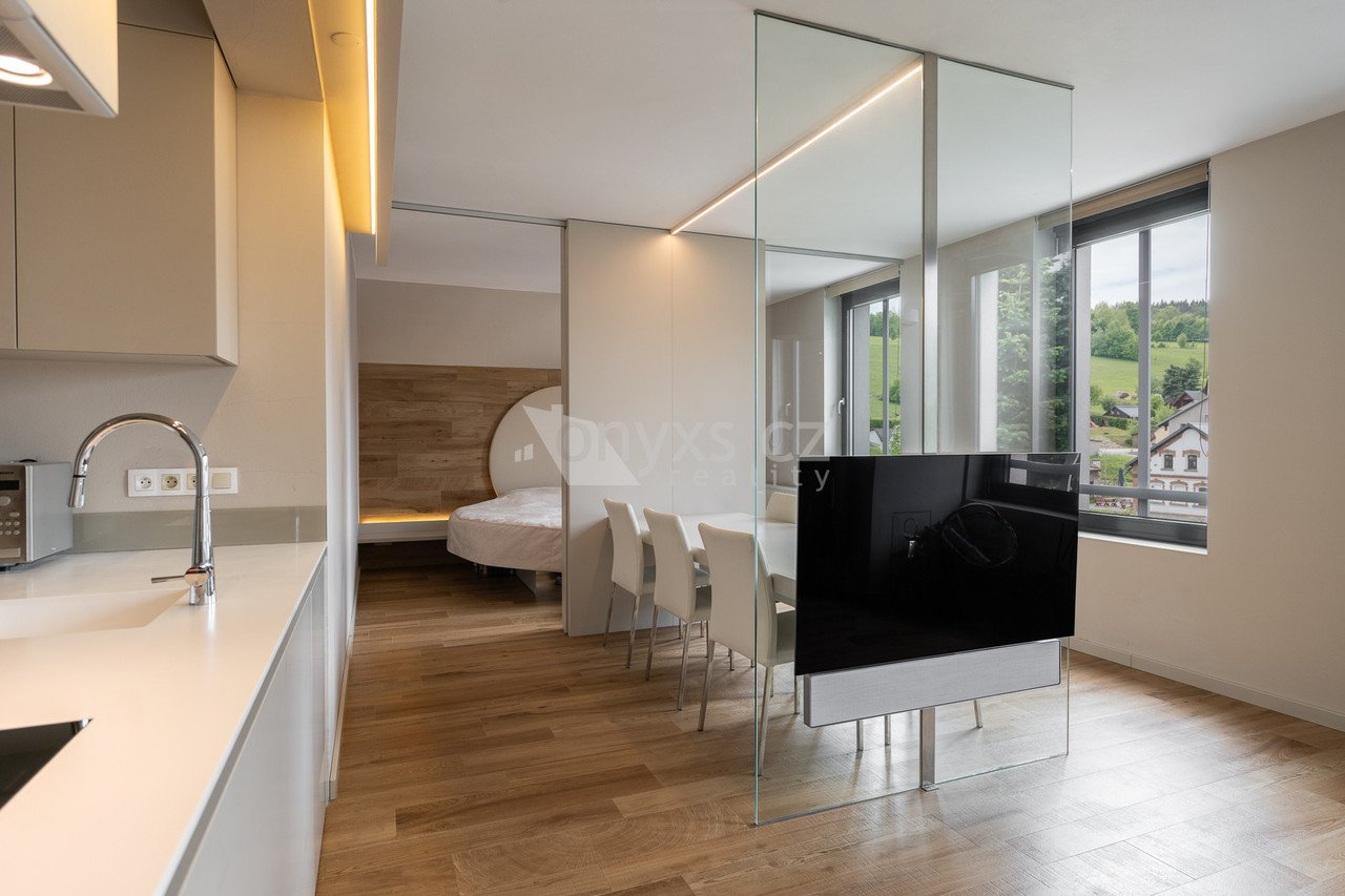Nabízíme k prodeji luxusní apartmán 2+kk o velikosti 79 m2 s vlastním parkovacím stáním v domě apartmánového typu Studios Rokytnice, nacházejícího se v centru Rokytnice nad Jizerou. Apartmán se nachází ve 2. patře domu s výtahem. Dispozičně se jedná o otevřené studio s kuchyňským koutem, jídelnou uprostřed apartmánu, ložnicí v levé části, která se dá otevřít, nebo uzavřít posuvnými dveřmi a relaxační částí v opačném rohu místnosti, kde se nachází sauna, sprcha, vířivka a vodní postel. Koupelna s umyvadlem, WC a dalším sprchovým koutem se nachází v další místností za kuchyňkou. K vytápění jednotky slouží elektrické přímotopy a krbové kamna, ohřev vody zajišťuje bojler. K jednotce patří jedno parkovací stání v domě a prostorný sklep v přízemí domu. Volné ihned.