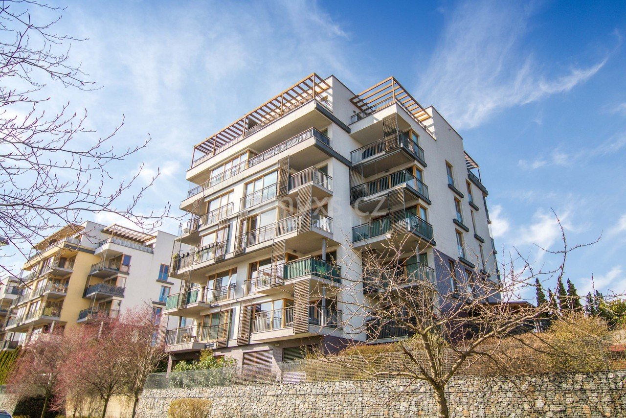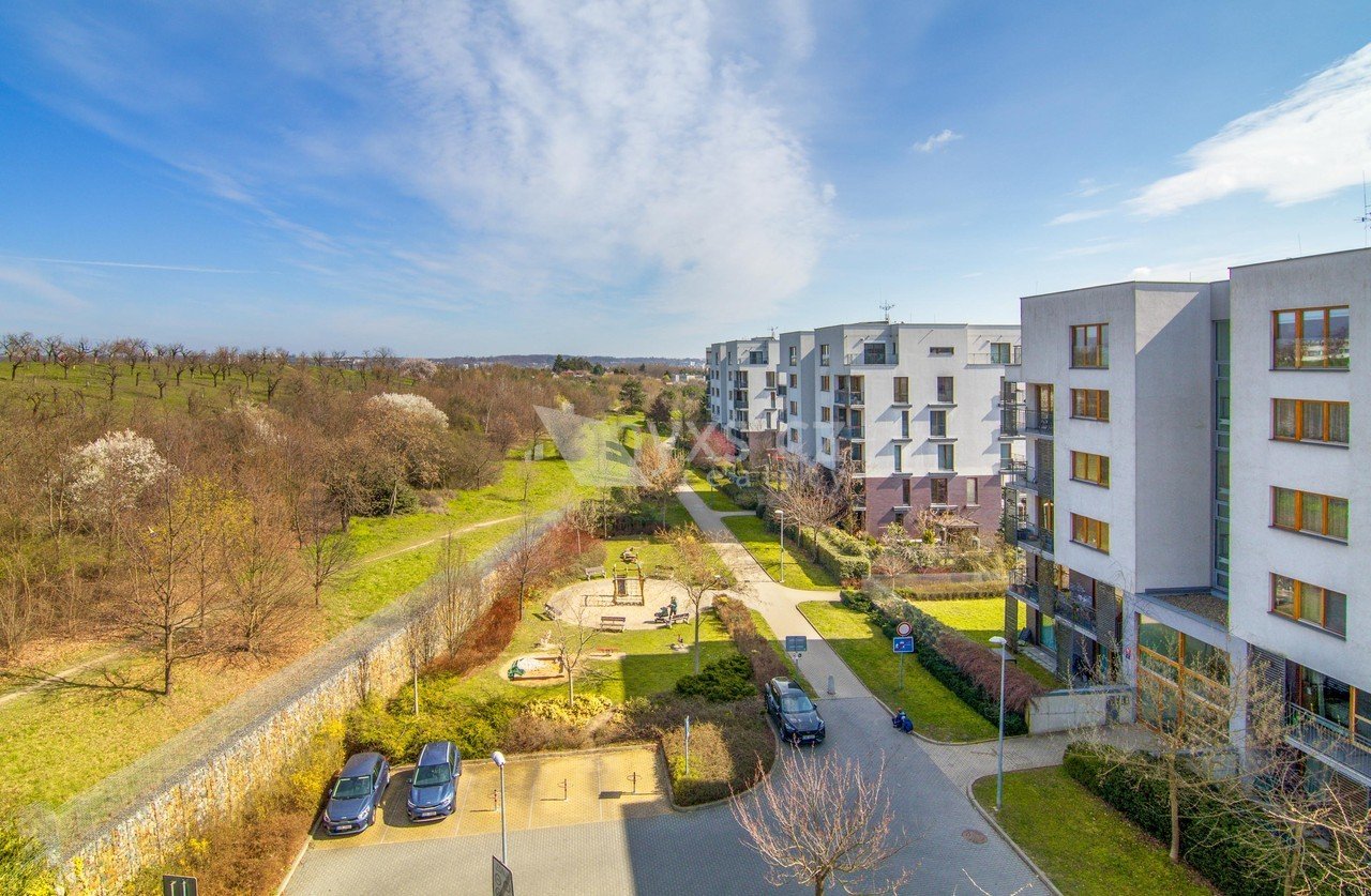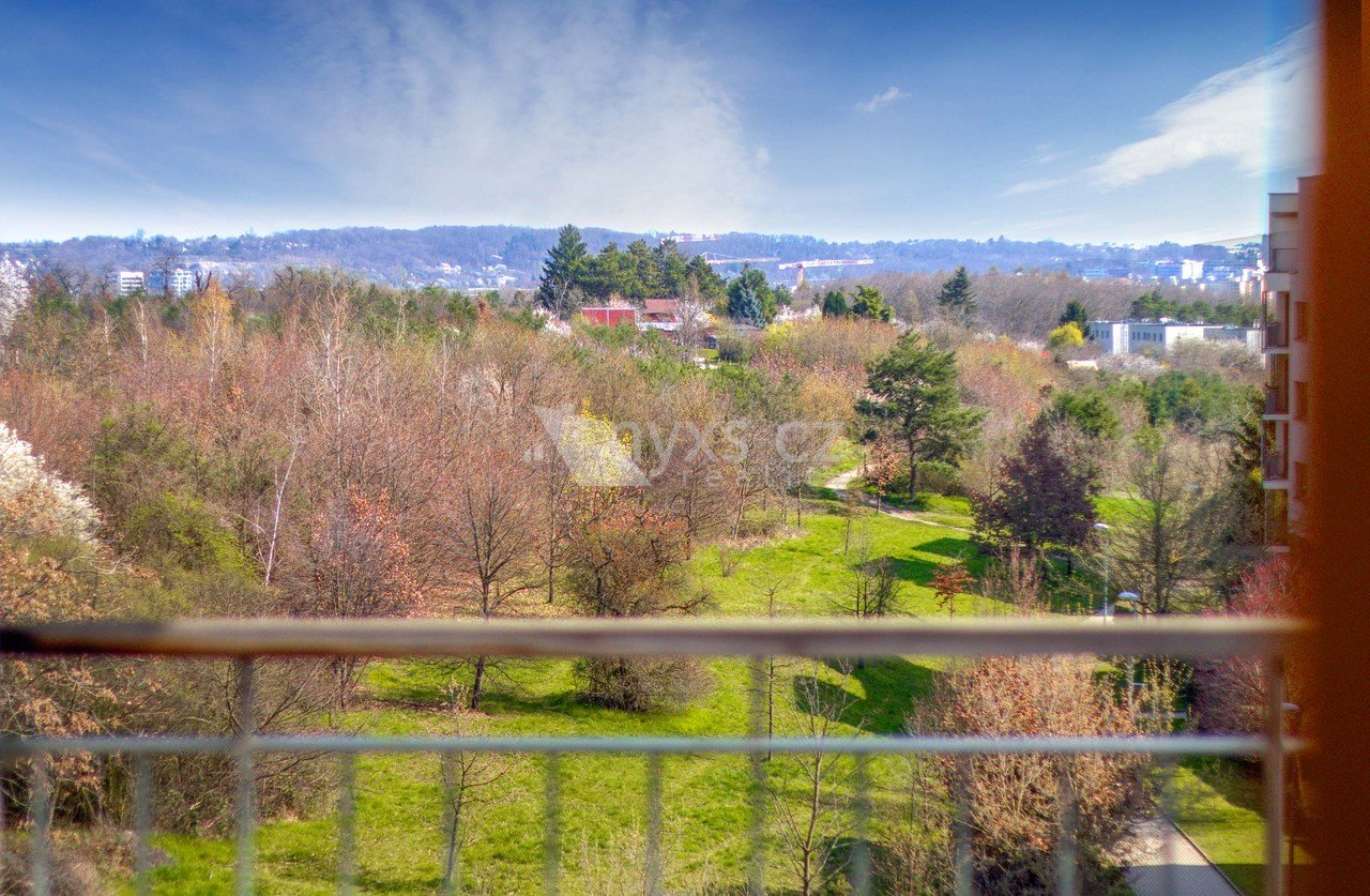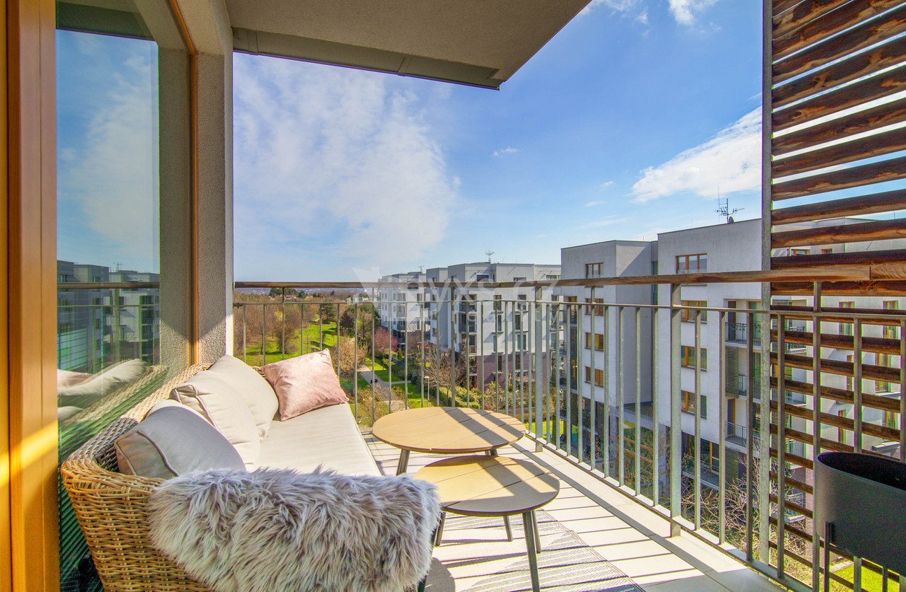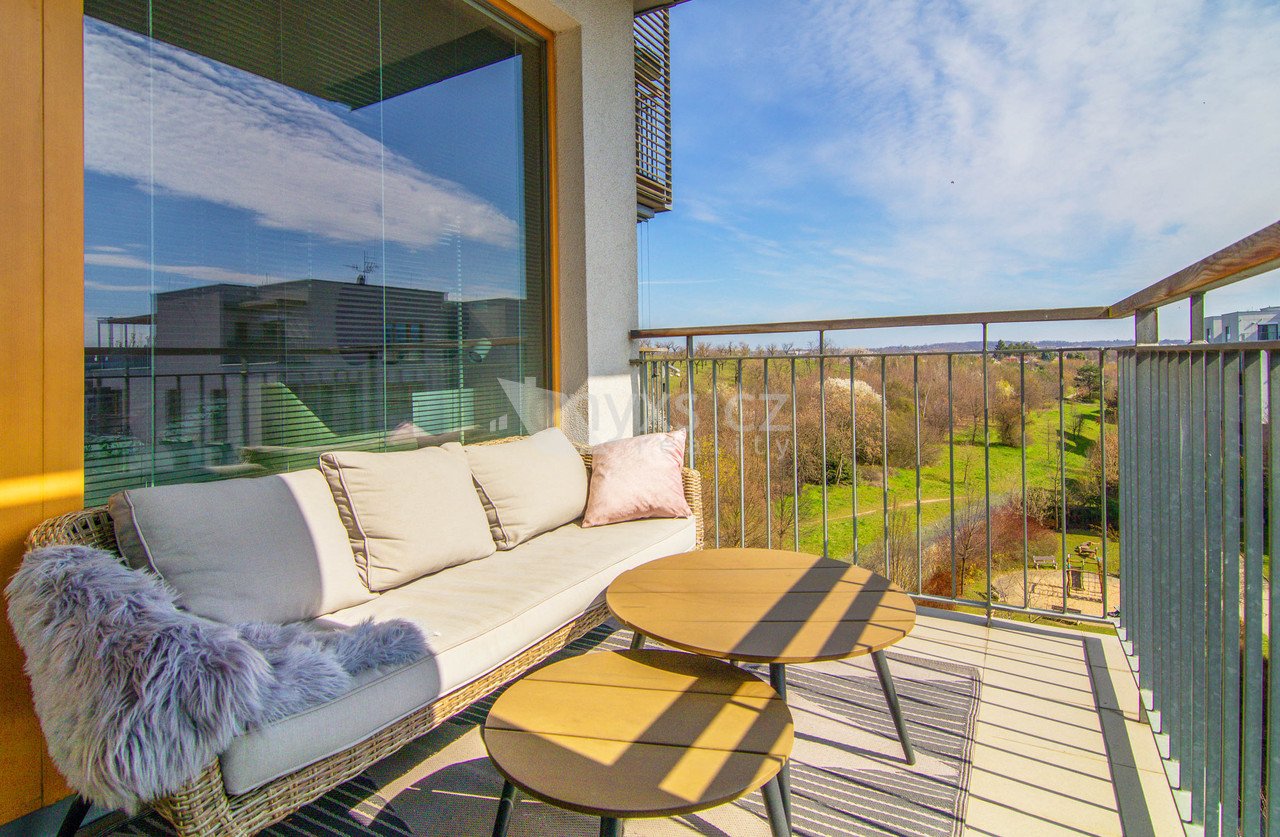 Na prostorném balkoně si vychutnáte ranní kávu i večerní klid. Výhled do přírody vám dá pocit, že bydlíte dál od ruchu města – přesto jste pořád v Praze.