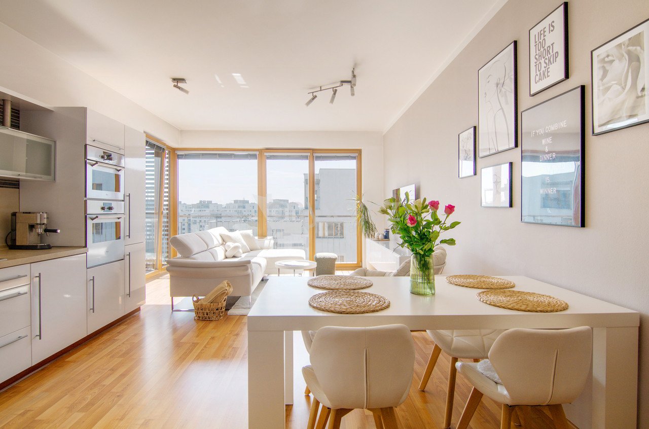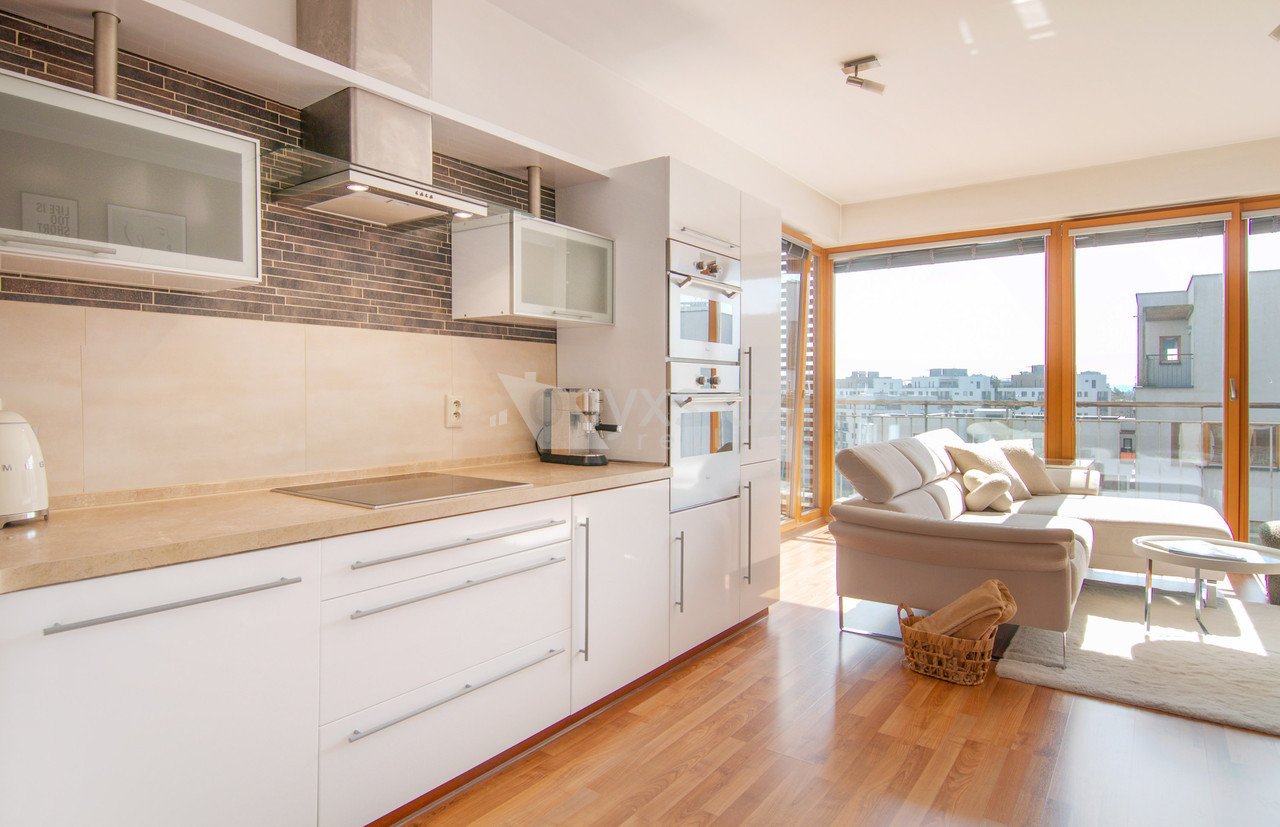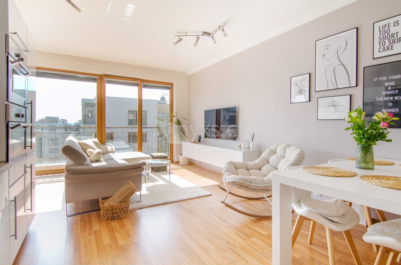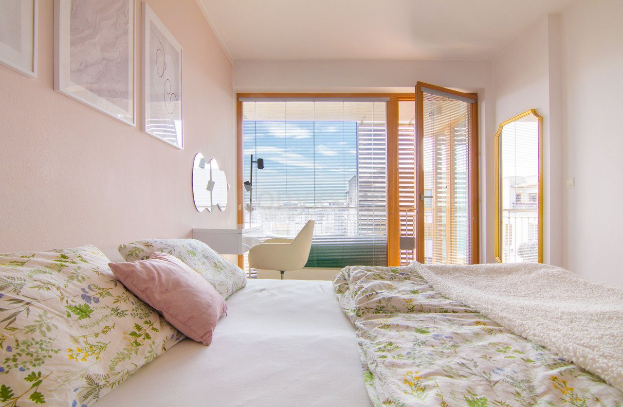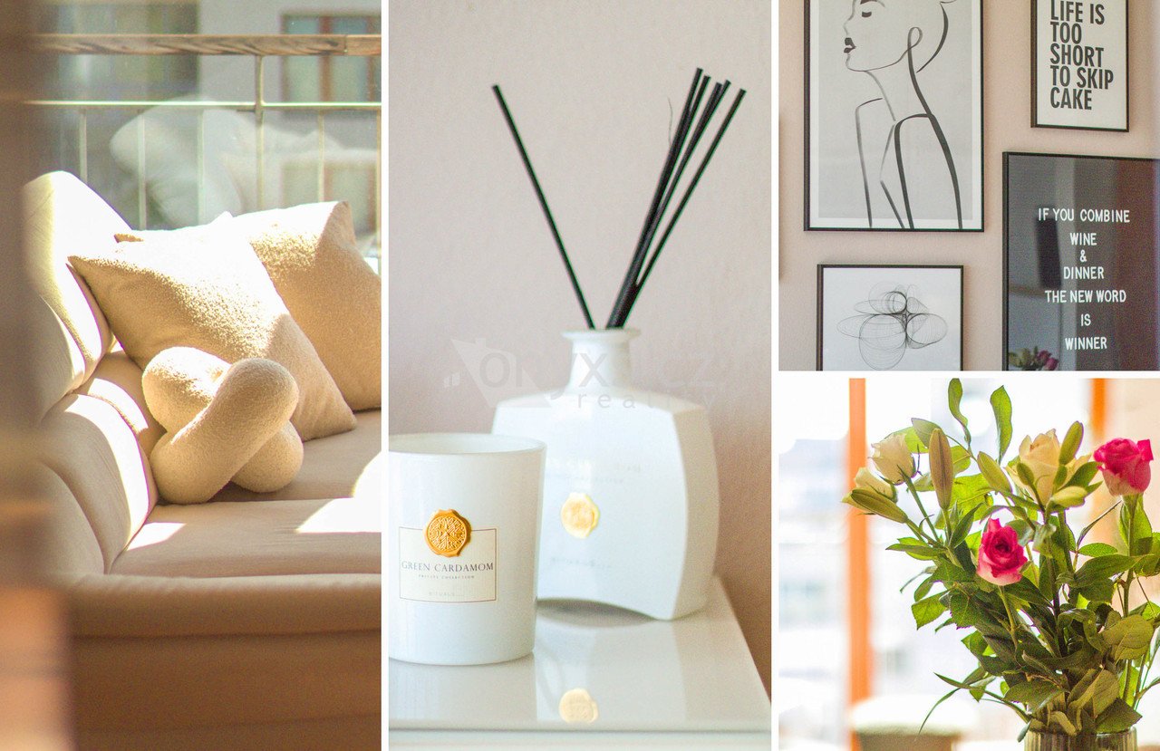 Díky velkým francouzským oknům a jižní orientaci je byt krásně prosvětlený po celý den. Interiér působí vzdušně, příjemně a okamžitě si ho zamilujete.