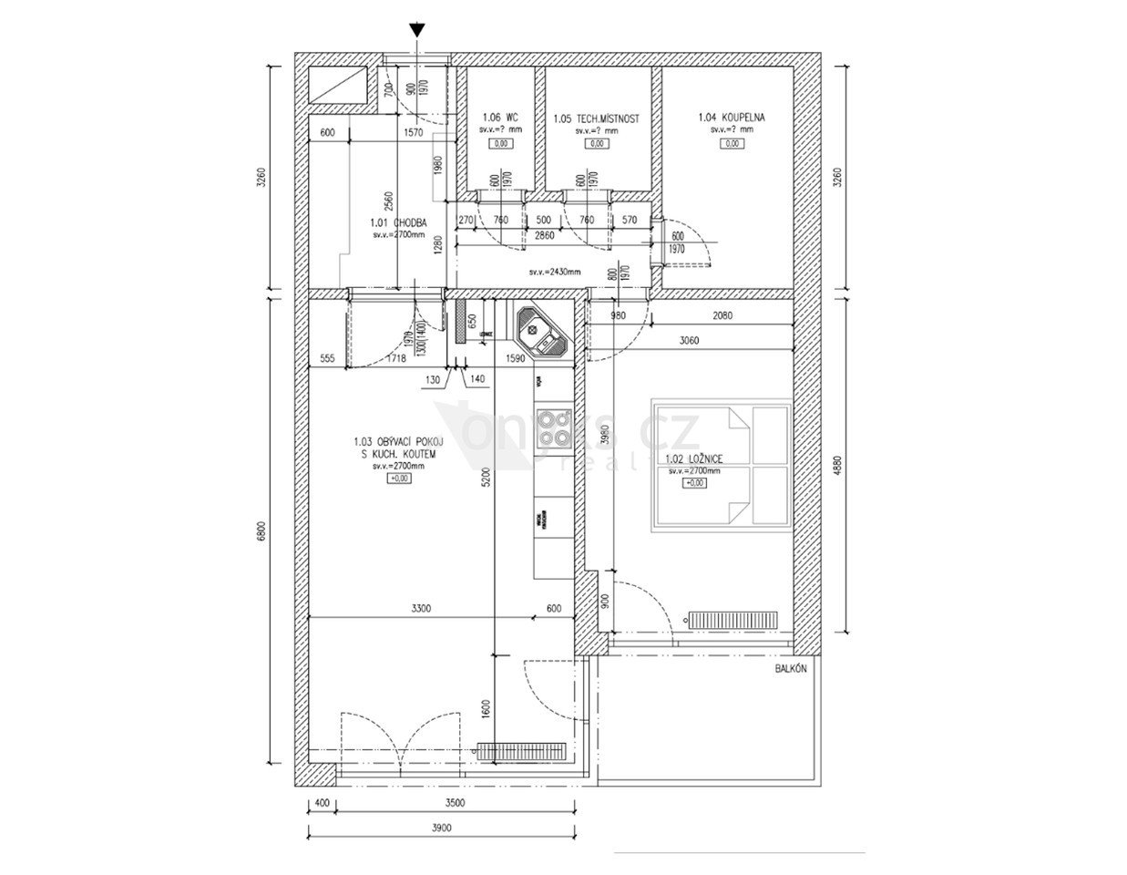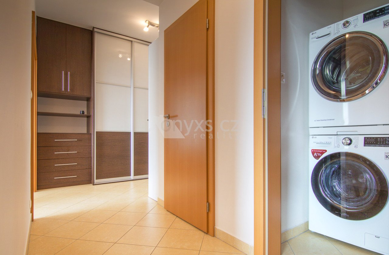 vstupní předsíň s vestavěnými skříněmi a botníkem, obývací pokoj s kuchyňskou linkou, jídelním koutem, ložnici, balkon se vstupy do obou pokojů, koupelnu se 2 umyvadly a vanou, samostatnou toaletu a technickou místnost.