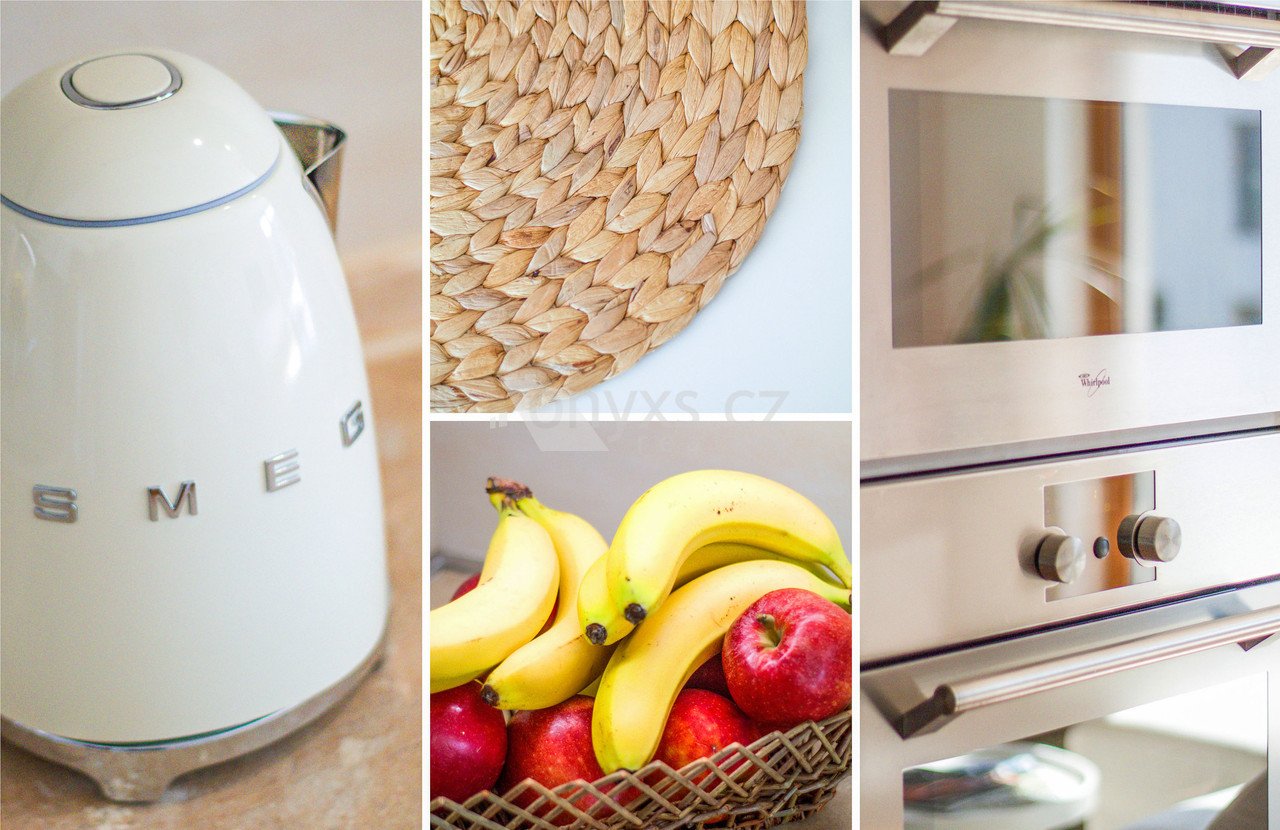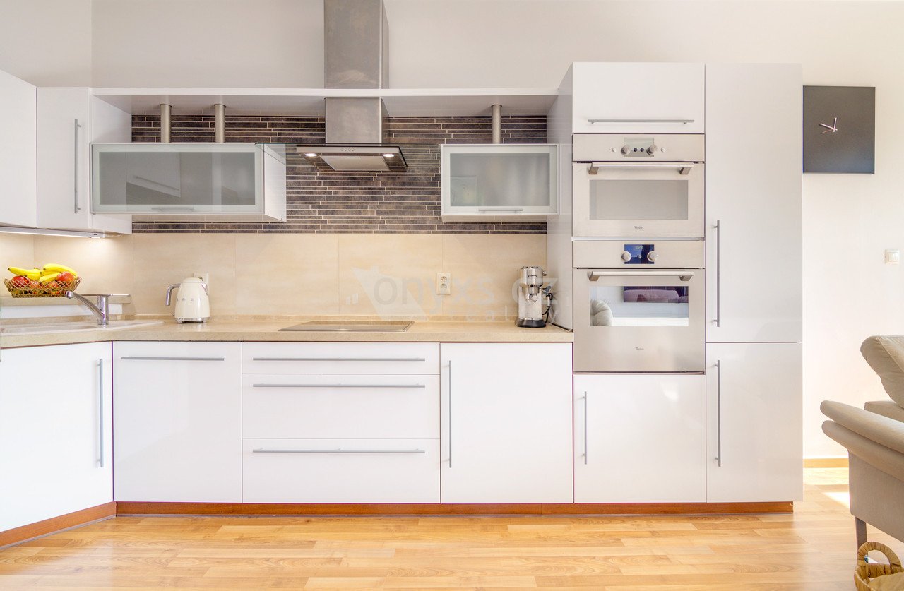 Keramická dlažba, plovoucí laminátová podlaha, dřevěná okna s dvojskly, kuchyňská linka včetně el. trouby, mikrovlnné trouby, indukční varné desky, digestoře a myčky.