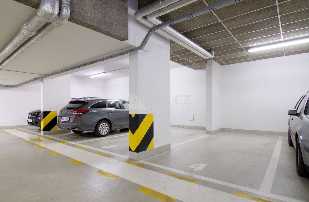 Auto zaparkujete bezpečně na svém místě v garážích. Pár kroků to máte na autobus a na tramvaj. Tramvají č. 9 jste odtud za 20 minut na Václavském náměstí.