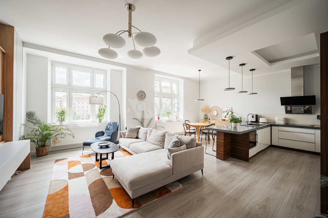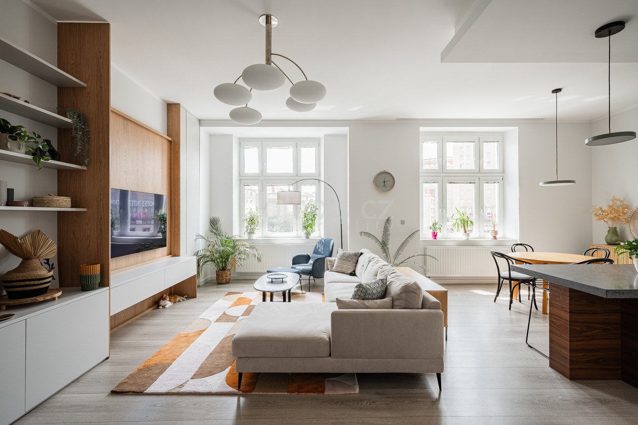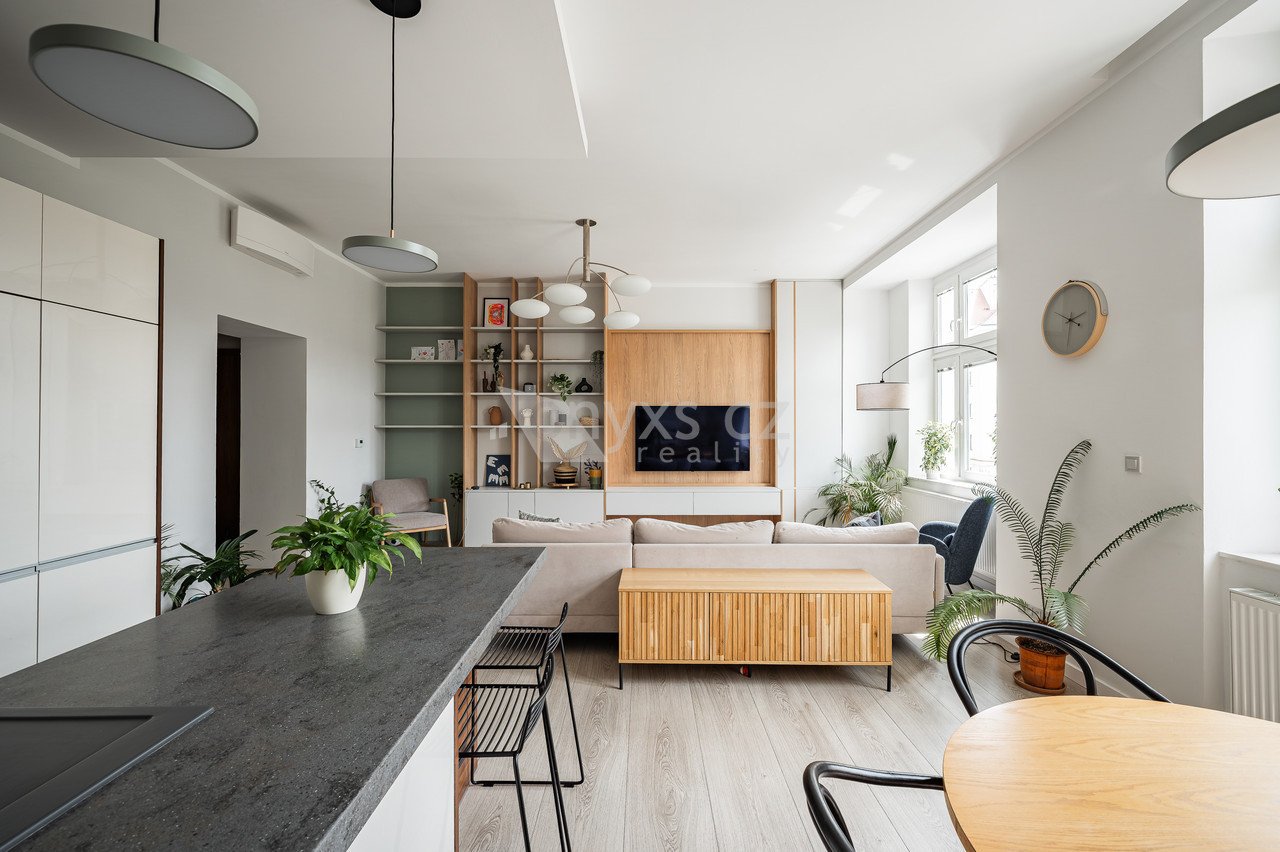 Tento vzdušný byt po rekonstrukci se nachází ve 2. patře a osloví především svou klidnou atmosférou a funkčním interiérem. K dispozici je vstupní chodba, na kterou navazuje působivý klimatizovaný obývací pokoj s jídelnou. Okamžitě zde upoutají vysoké stropy, nadstandartní užitná plocha, designová úložná stěna a chytře promyšlená dispozice. Na obývací pokoj navazuje plně vybavený kuchyňský kout se spotřebiči (sklokeramická deska, trouba, lednice, mrazák, myčka nádobí) a elegantní kuchyňský ostrůvek.
