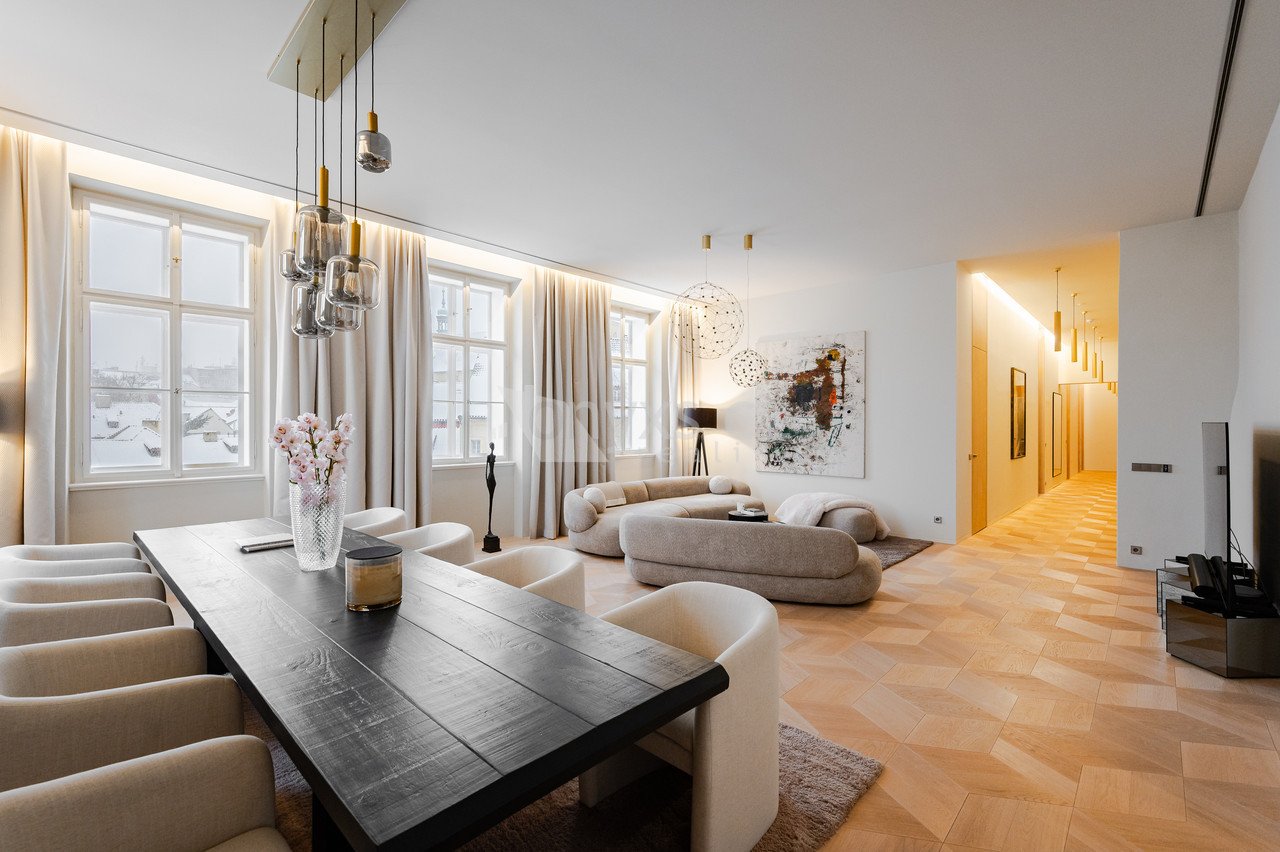 Nabízím pronájem reprezentativního částečně zařízeného bytu (210 m2) se 4 ložnicemi, 3 koupelnami a parkováním v ojedinělém rezidenčním areálu Obecní Dvůr v srdci pražského historického centra. Byt byl nominován na cenu German Design Awards 2025 a pochází z dílny architektonického studia Under Construction. Nachází se v oceňované stavbě, která nabízí 12 jedinečných rezidencí rozprostřených do tří historických budov a jedné novostavby situovaných kolem soukromého areálu zeleného dvora, který je určen výhradně pro potřeby rezidentů. Celý komplex byl navržen renomovaným architektem Ricardem Bofillem.