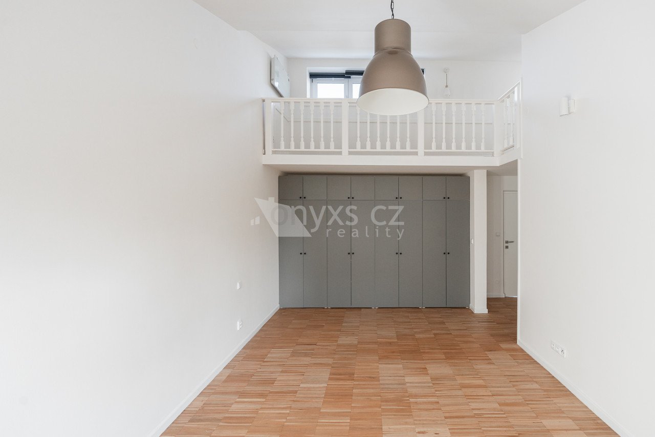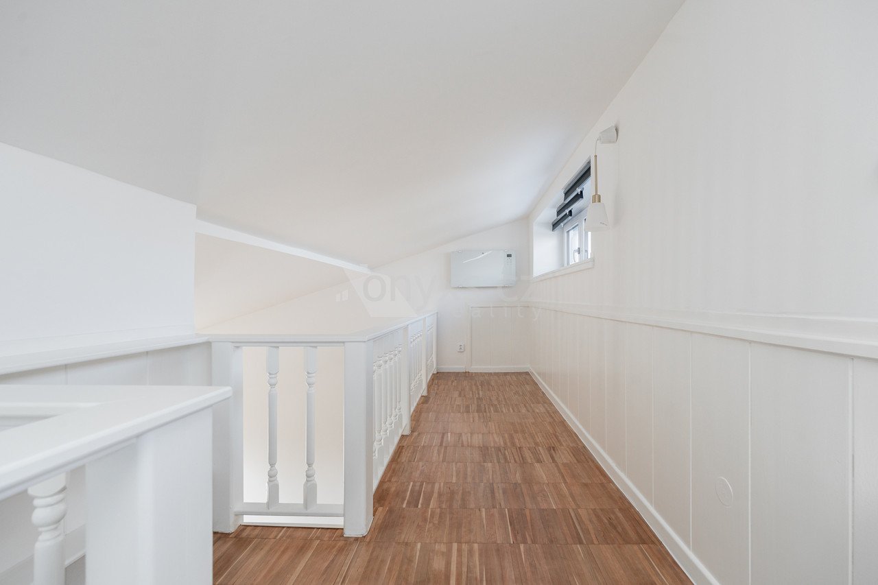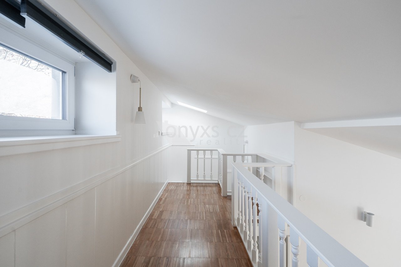 Dřevěné schodiště vede do patra s chodbou a vstupem na lodžii a třemi ložnicemi. Dvě z ložnic jsou orientovány do zahrady a obě disponují vestavěnými skříněmi, šatnou a menšími galeriemi. V patře jsou dále k dispozici 3 koupelny, jedna z nich en-suite. K domu náleží sklep o velikosti 24 m2.