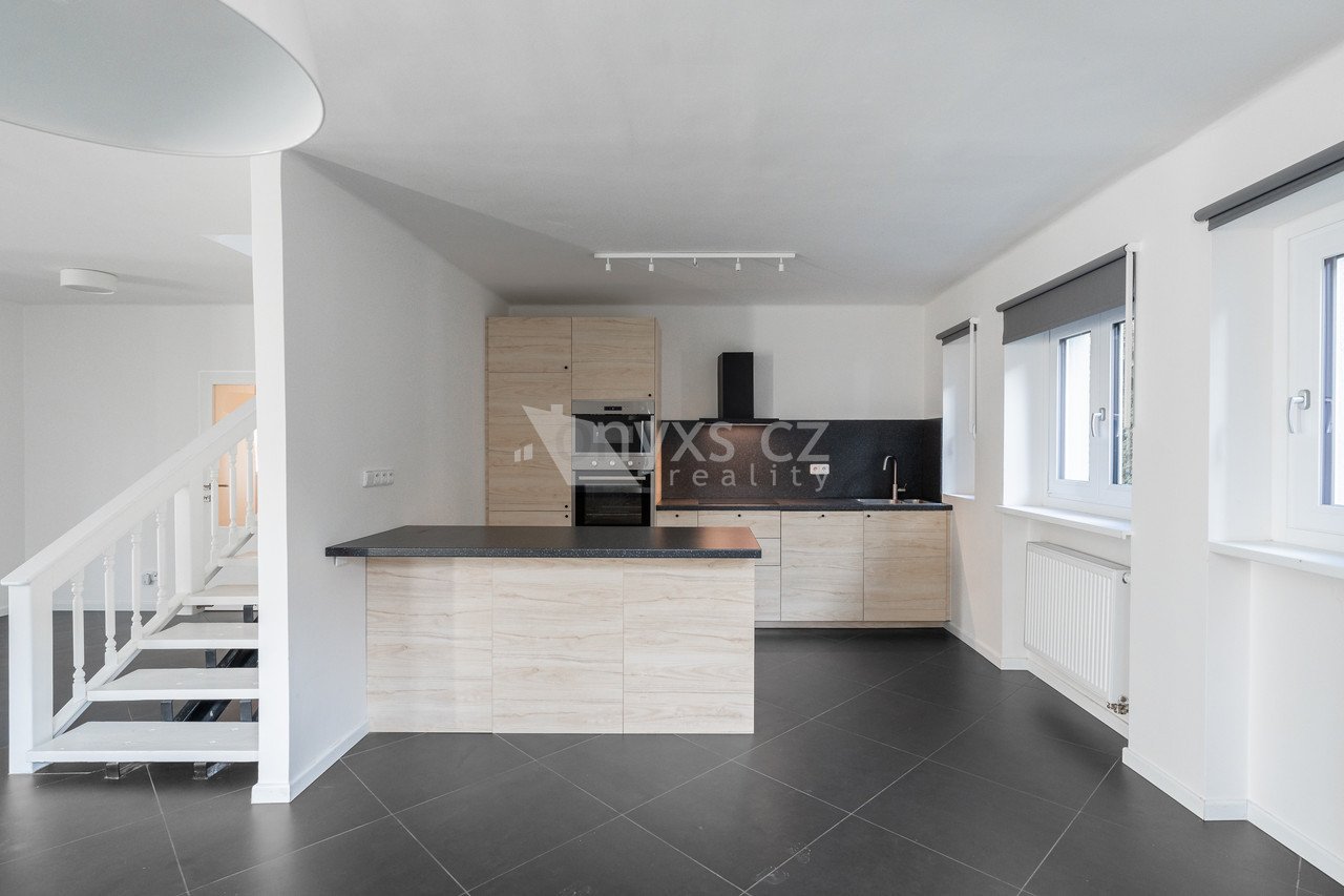 Ve spodní části se nachází vstupní hala, technické zázemí, komora, koupelna a obývací pokoj s přímým vstupem na klidnou zahradu se vzrostlou zelení. Obývací pokoj přechází v jídelní prostor a kuchyňský kout.