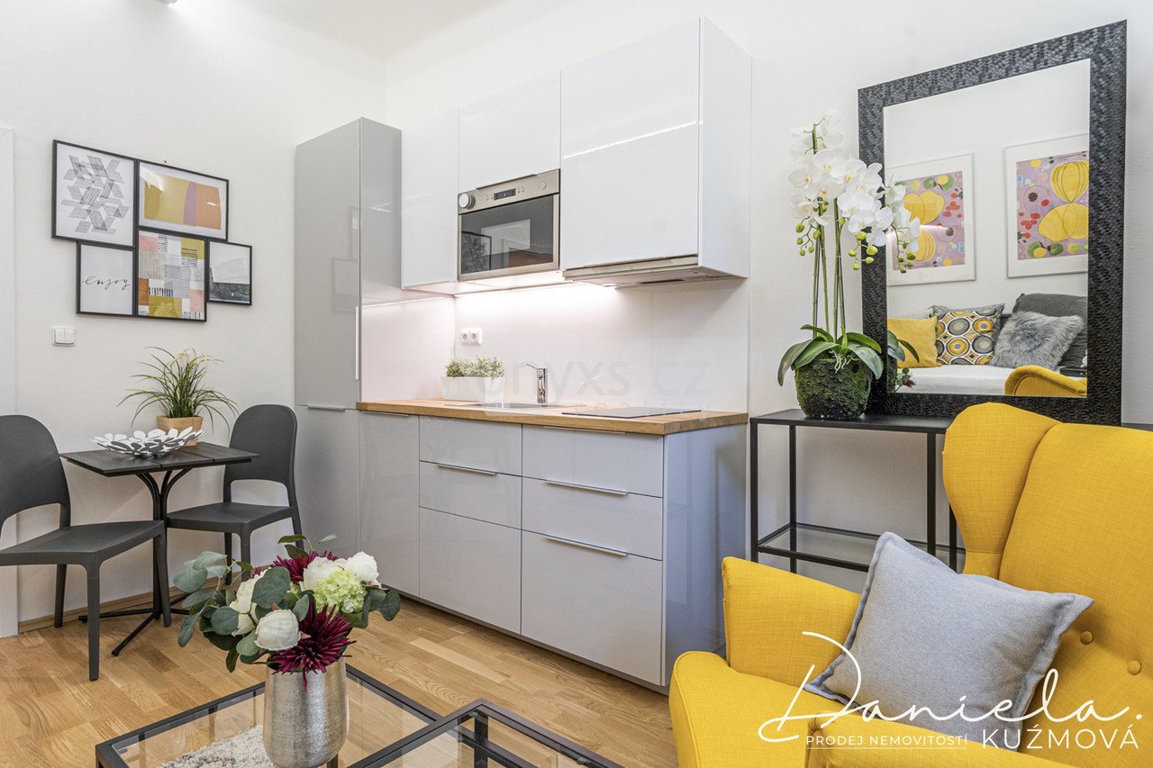 Byt je plně vybavený – k dispozici je kuchyňská linka včetně myčky, dostatek úložných prostor, rozkládací postel a koupelna s WC a sprchovým koutem.